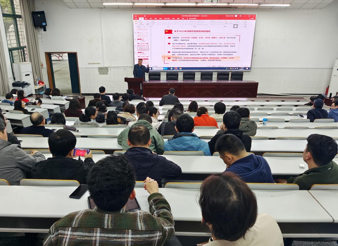 最后,李余廷书记通报了学校关于2022年清明节放假的安排,并结合学校有关疫情防控工作的要求,从离渝和返校的疫情防控政策要求、清明节文明祭祀、廉洁自律过节和节假日值班值守等方面,进行了工作布置和重点提醒。