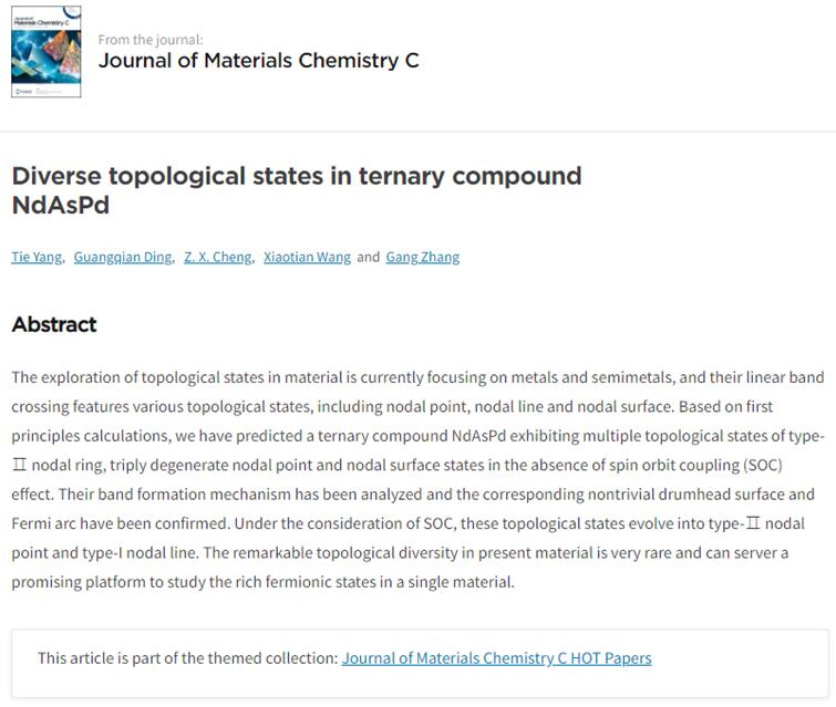 最近,h漫 青年教师杨铁博士等在材料拓扑元素方向的研究取得重要进展,所形成的阶段性成果Diverse topological states in ternary compound NdAsPd (论文链接://doi.org/10.1039/D0TC02024A) 发表在材料科学Top期刊J. Mater. Chem. C上,并被编辑遴选为热点论文(Hot Paper)。