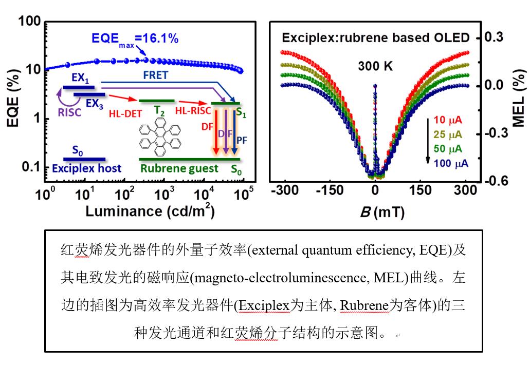 OLEDs在平板显示和固态照明领域具有广阔的应用前景,尽管基于有机发光的手机显示屏和电视已开始市场化,但进一步提升其发光效率和延长其使用寿命仍然是该领域的两大研究方向。因理论上能够实现100%的内量子效率,具有常规RISC (T1®S1)通道的热活化延迟荧光(Thermally-assisted delayed fluorescence, TADF)有机材料和具有HL-RISC (T2®S1)过程的有机半导体是目前OLEDs领域的热点研究体系,这是由于无论是RISC还是HL-RISC都可以将占激子总数3/4的不发光三重态T激子转变成发光的单重态S激子,从而实现发光效率的成倍增强。显然,研究这些激子及其前驱体(precursor, 如极化子对(polaron-pair))和TADF材料以及激基复合物材料中电荷转移态(charge-transfer states)激子的形成机制及其演化规律对进一步认识OLEDs的器件物理和设计制造高效率OLEDs具有重要的科学意义和应用价值。近年来,熊祖洪课题组一直致力于采用有机半导体光电子器件中多种微观过程具有的指纹式磁效应(包括magneto-conductance、magneto-electroluminescence、magneto-photoluminescence以及magneto-photocurrent)曲线,系统深入地研究了多种有机光电子体系的器件物理并取得了一系列研究成果。相关成果以熊祖洪教授为通讯作者和西南大学为第一单位在Physical Review Applied (IF=4.658)、 Applied Physics Letters (IF=3.597, 82种nature index期刊之一)、The Journal of Physical Chemistry Letters (IF=7.81, 82种nature index期刊之一)、The Journal of Physical Chemistry C (IF=4.404)、Journal of Materials Chemistry C (IF=7.059)、Physical Chemistry Chemical Physics (IF=3.735)以及ACS Applied Materials & Interfaces (IF=8.758)、Advanced Functional Materials (IF=16.836, 82种nature index期刊之一)、Advanced Optical Materials (IF=8.286)和Scientific Reports (IF=4.576)等国际知名期刊上先后发表了20余篇高质量学术论文,获准国家发明专利1项,得到3项国家自然科学基金面上项目、重庆市杰出青年基金和中央高校基本科研业务费专项基金重点项目的资助。