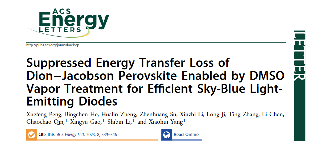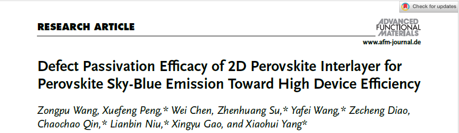 近日,新型发光器件团队青年教师彭雪峰和杨晓晖研究员在钙钛矿蓝光器件研究方向取得新进展,相关成果以题为Defect Passivation Efficacy of 2D Perovskite Interlayer for Perovskite Sky-Blue Emission Toward High Device Efficiency” 发表在国际材料领域知名学术期刊《Advanced Functional Materials》(影响因子:19,中科院一区top期刊)上。这是课题组继今年在国际能源领域知名学术期刊《ACS Energy Letters》(影响因子:22,中科院一区top期刊)发表题为“Suppressed Energy Transfer Loss of Dion-Jacobson Perovskite Enabled by DMSO Vapor Treatment for Efficient Sky-Blue Light-Emitting Diodes论文后,取得的又一进展。h漫 为第一完成单位,合作者有河南师范大学秦朝朝教授、中科院上海先进研究所苏圳煌研究员和高兴宇研究员、电子科技大学李世彬教授、广州大学王亚飞副教授和重庆师范大学牛连斌教授。