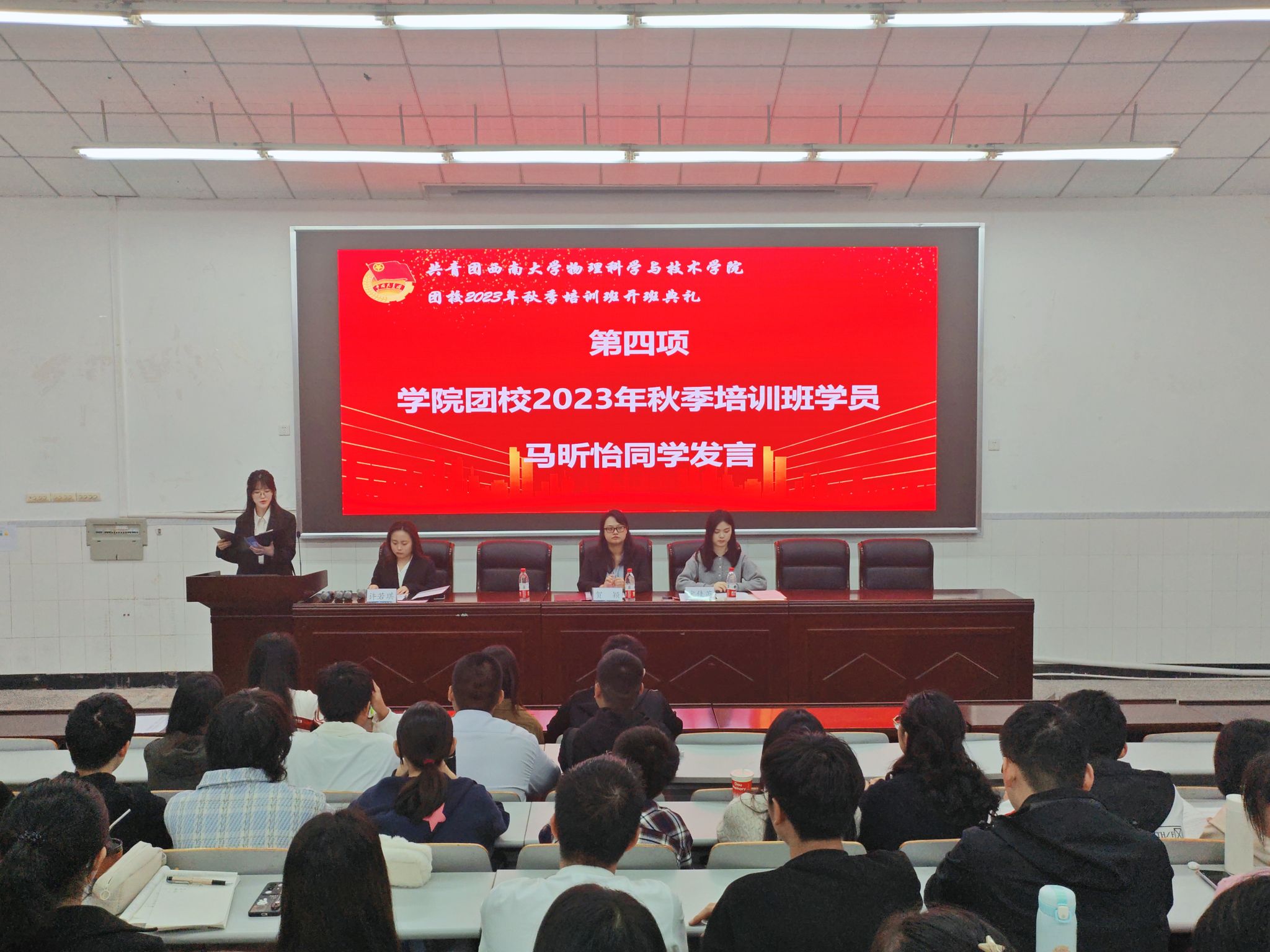h漫 团校2023年秋季培训班学员代表马昕怡同学发言,她表示自己将秉承“格物致理,崇德尚善”的院训善学善思,不折不扣完成团校学习任务,并号召全体学员创优争先,充分发挥学生骨干表率作用;深学笃信,在知行合一中磨练才干本领。