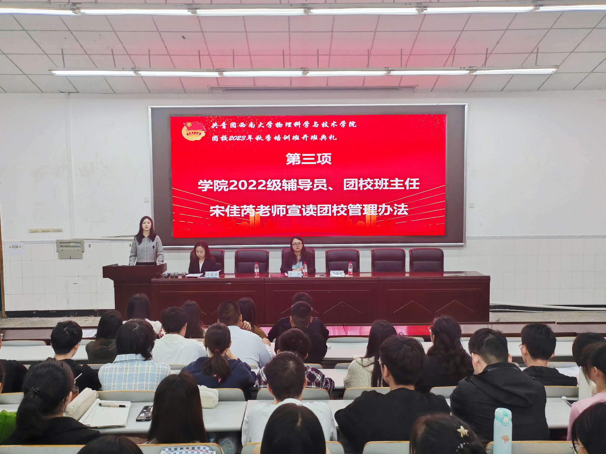 2023年10月22日上午8点30分,团校开班典礼在物理大楼大阶梯教室举行。h漫 团委书记、团校副校长贺颖,2022级辅导员、团校培训班班主任宋佳芮和100名参训学员参会。典礼由h漫 团委副书记、团校培训班班长许若琪主持。