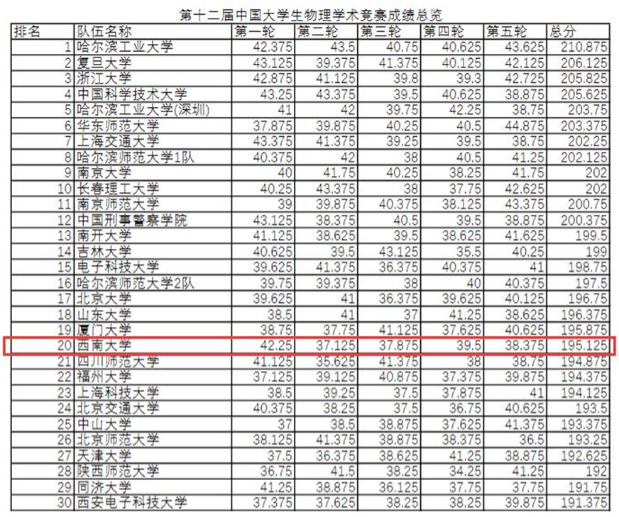 近日,第十二届中国大学生物理学术竞赛(CUPT)落下帷幕。在历时四天五轮的激烈角逐中,西南大学CUPT代表队表现亮眼,面对从北京大学、清华大学、浙江大学等全国超过300所高校遴选出的优秀队伍,在与复旦大学、南开大学等国内一流知名高校的正面对抗中力压群雄,荣获国家级二等奖与最佳风采奖(全国仅三所学校),取得了西南大学在该项比赛中历史最好排名,同时获得直通第十三届CUPT中国大学生物理学术竞赛国赛资格。