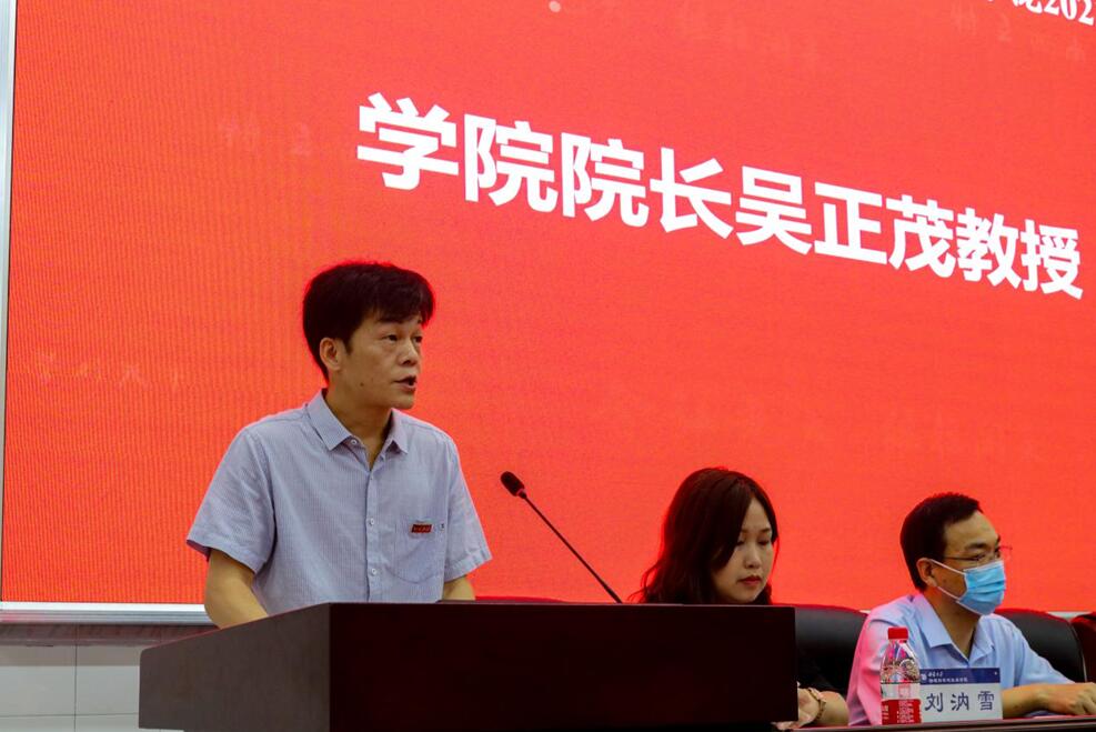 在庄严的国歌声中,见面会正式拉开了序幕。院长吴正茂教授首先致辞,他代表全院师生员工向新生们表示热烈的欢迎和衷心的祝贺。吴院长从办学历史、师资队伍、教学条件、科研成果等方面介绍了h漫 的基本情况,并勉励大家用“与祖国同频的爱国心”“跟自己较劲的拼搏心”和“对生活微笑的感恩心”开启寻梦、追梦、圆梦的新征途,祝愿同学们成长成为心怀感恩、积极奉献、有情怀、有担当的时代青年。