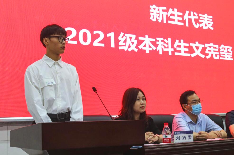 2021级本科生物理学师范专业文宪玺同学作为新生代表发言,他讲述了自己选择物理、投身教育的初心,表示会秉承h漫 院训精神,努力提升学科素养,不负时代,不负使命、不负青春。