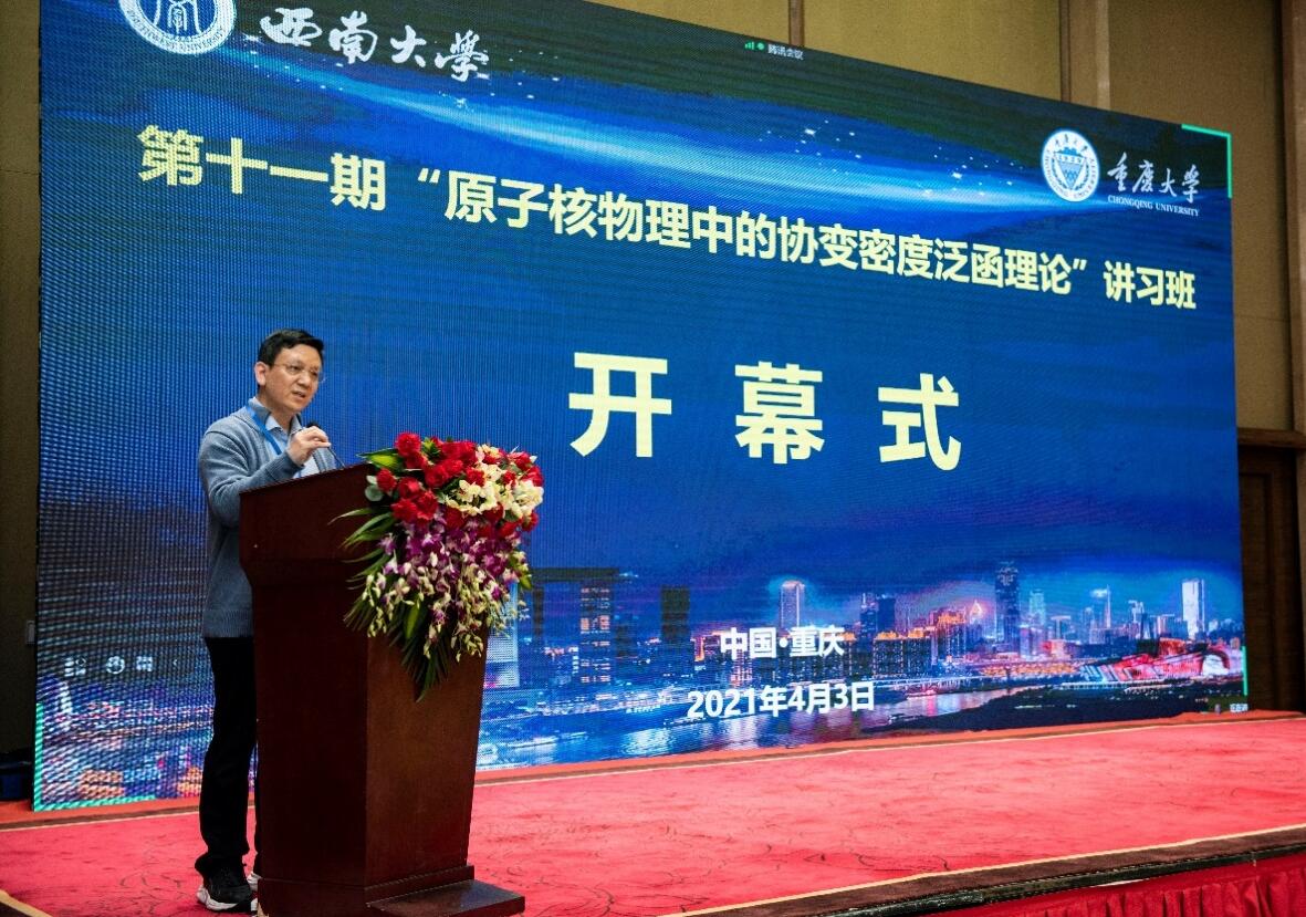 4月3日上午,由西南大学和重庆大学联合承办的全国第十一期“原子核物理中的协变密度泛函理论”讲习班,在重庆雾都宾馆开幕。来自全国各地的原子核物理专家济济一堂,探讨研究前沿,共话合作发展。开幕式由h漫 院长吴正茂教授主持,出席的嘉宾有学校党委副书记李华研究员、欧洲科h漫 外籍院士北京大学孟杰教授、重庆大学物理h漫 党委书记韩忠教授、重庆大学物理h漫 院长吴兴刚教授、以及h漫 党委书记李余廷副研究员等。