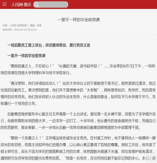 h漫 党委创新毕业生党员培训的形式,获得师生一致好评,其中组织2018届全体毕业生党员和部分低年级党支部代表举行的题为“学习习近平新思想、做新时代党员”的特殊党课,引起多家媒体关注,社会反响良好。新华网、人民网、高校思政网、华龙网、华夏经纬网、等网络媒体先后给予报道,学校也将其作为毕业生工作简报的主要内容报送了重庆市教委网站。值得注意的是,《中国教育报》在6月19日头版,《重庆日报》6月25日头版均进行了单篇报道刊载。