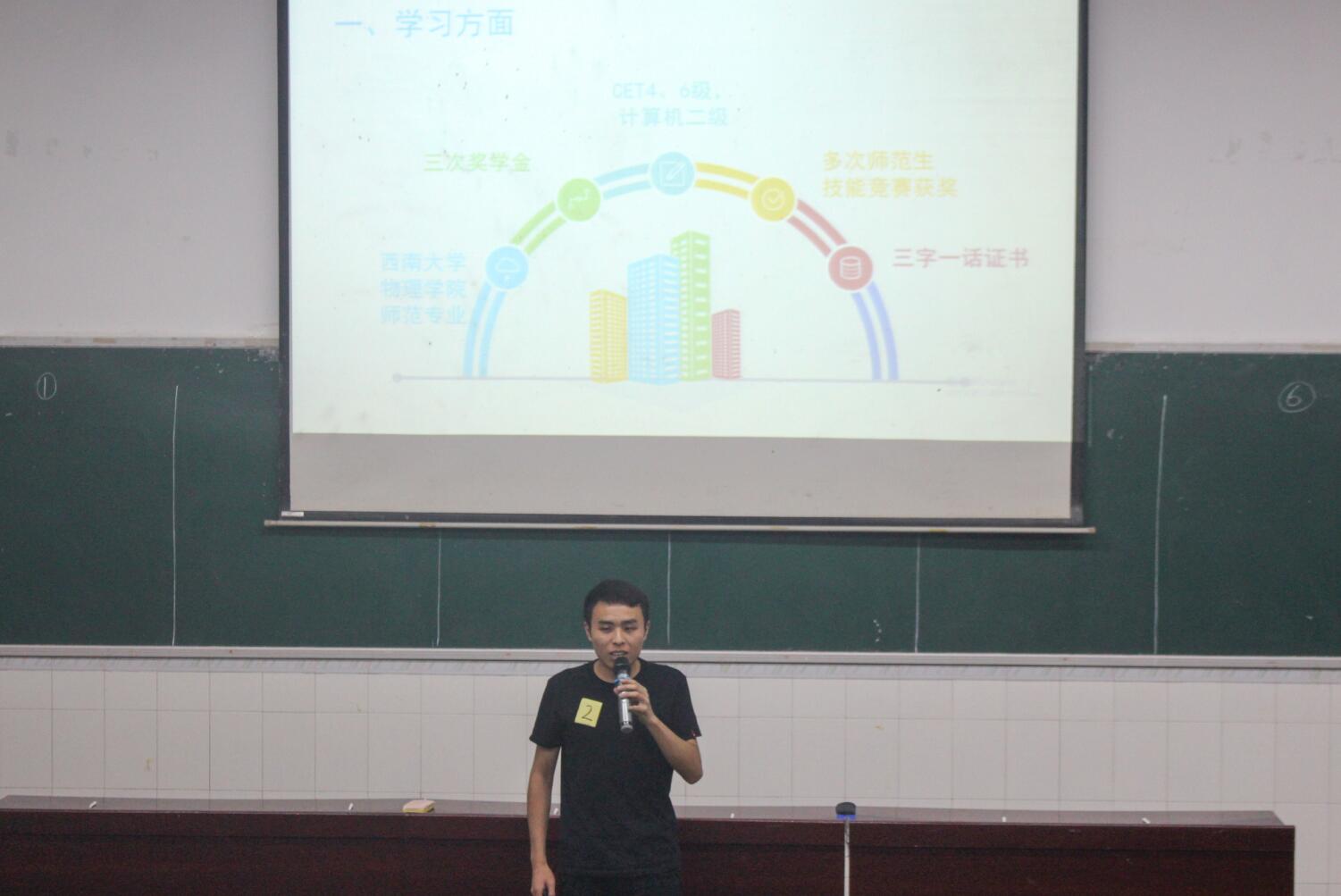 比赛分自我介绍、面试问答、笔试、模拟教学四个环节。在自我介绍及面试问答环节中,选手们思路清晰、从容不迫,介绍自己的优势特长,分享自己的教育理念和班级管理想法。第一个登场的选手是2016级师范3班任小芳同学,她从学习情况、社会工作以及个人性格三个方面“推荐”自己;2016级师范4班刘光杰同学借用习近平总书记提出的“四有教师”介绍了自己的核心竞争力;2015级师范4班唐瑜鞠同学从加强班级文化建设的角度应答了“如何帮助学业后进生”这一现场提问。