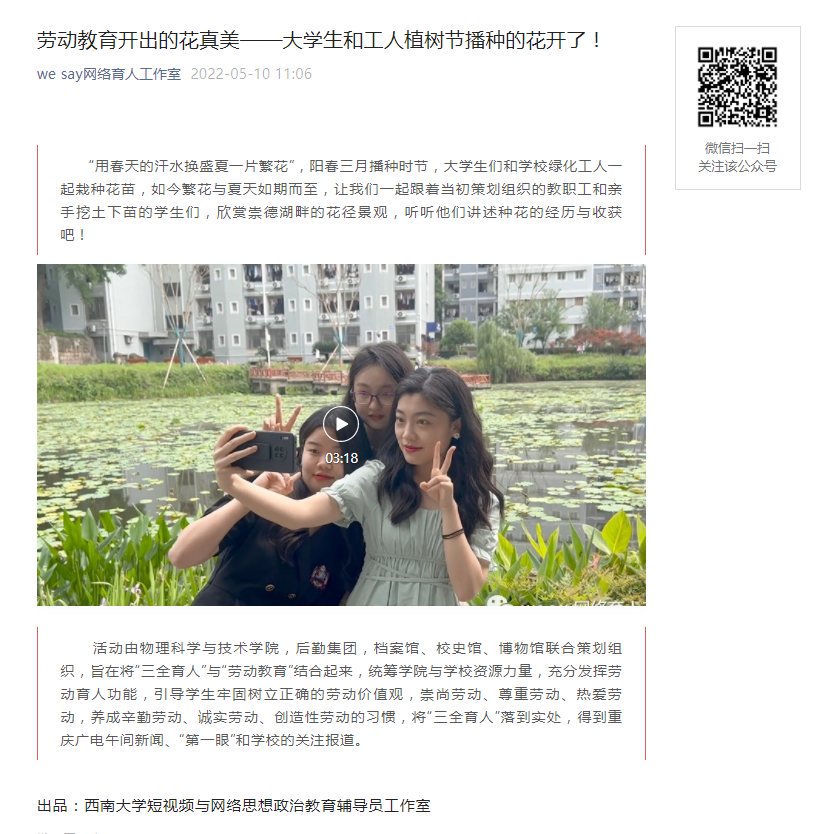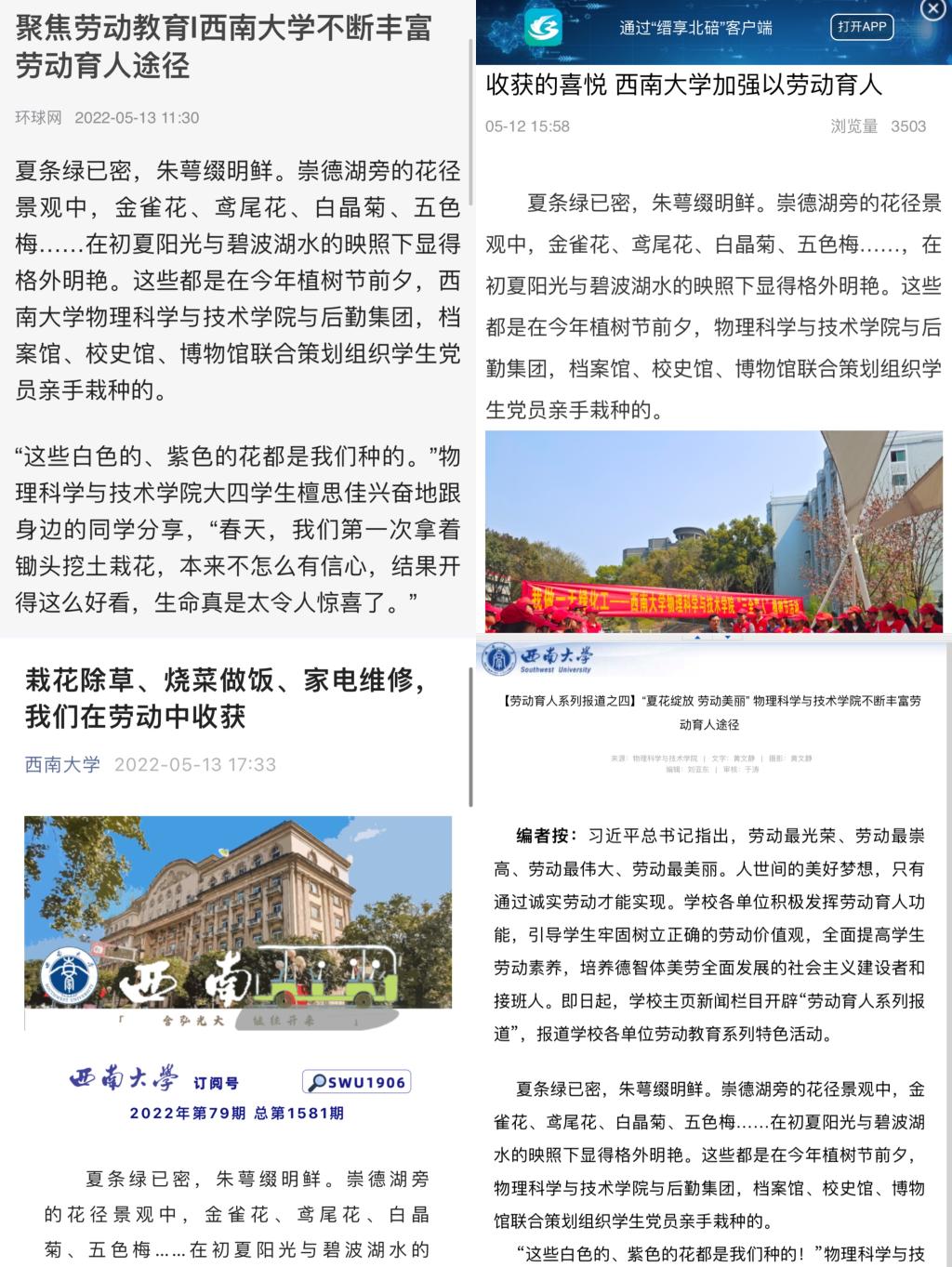 劳动最光荣,劳动最幸福。h漫 本次劳动教育成果和总结受到了环球网、北碚区媒体、学校官网主页、学校微信公众号的报道发布。h漫 未来还将不断探索新途径新方式,提升劳动教育的丰富度,激励大学生争做新时代的奋斗者。