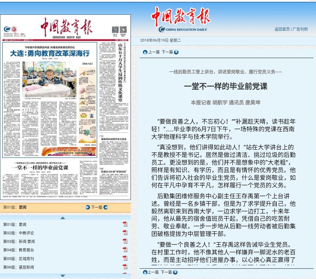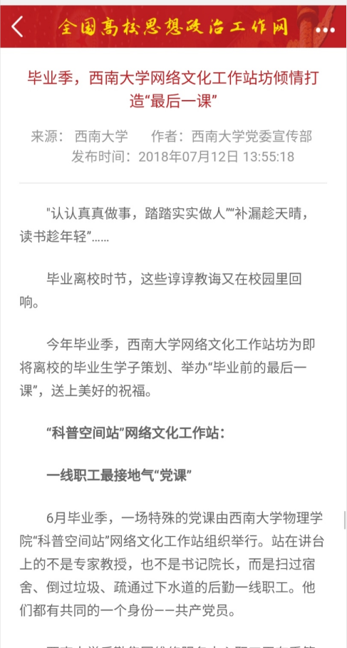 全过程开展劳动教育,强化劳动观念。h漫 立足特色育人品牌“最后一节思政课”中,多年来都聚焦劳动教育,例如2018年请后勤一线员工讲党员故事,2019年请食堂大厨上“金牌厨师课”。传承半个世纪的“红帽子”志愿服务队,则长期坚持美化西大、维修家电等劳动服务等,全覆盖了每一届物院学子。h漫 始终将劳动教育贯穿四年校园生活,在劳动文化浸润中促进学生树立劳动意识、增强劳动观念、养成劳动习惯,弘扬勤俭、奋斗、创新、奉献的劳动精神,服务他人和社会,强化社会责任感。