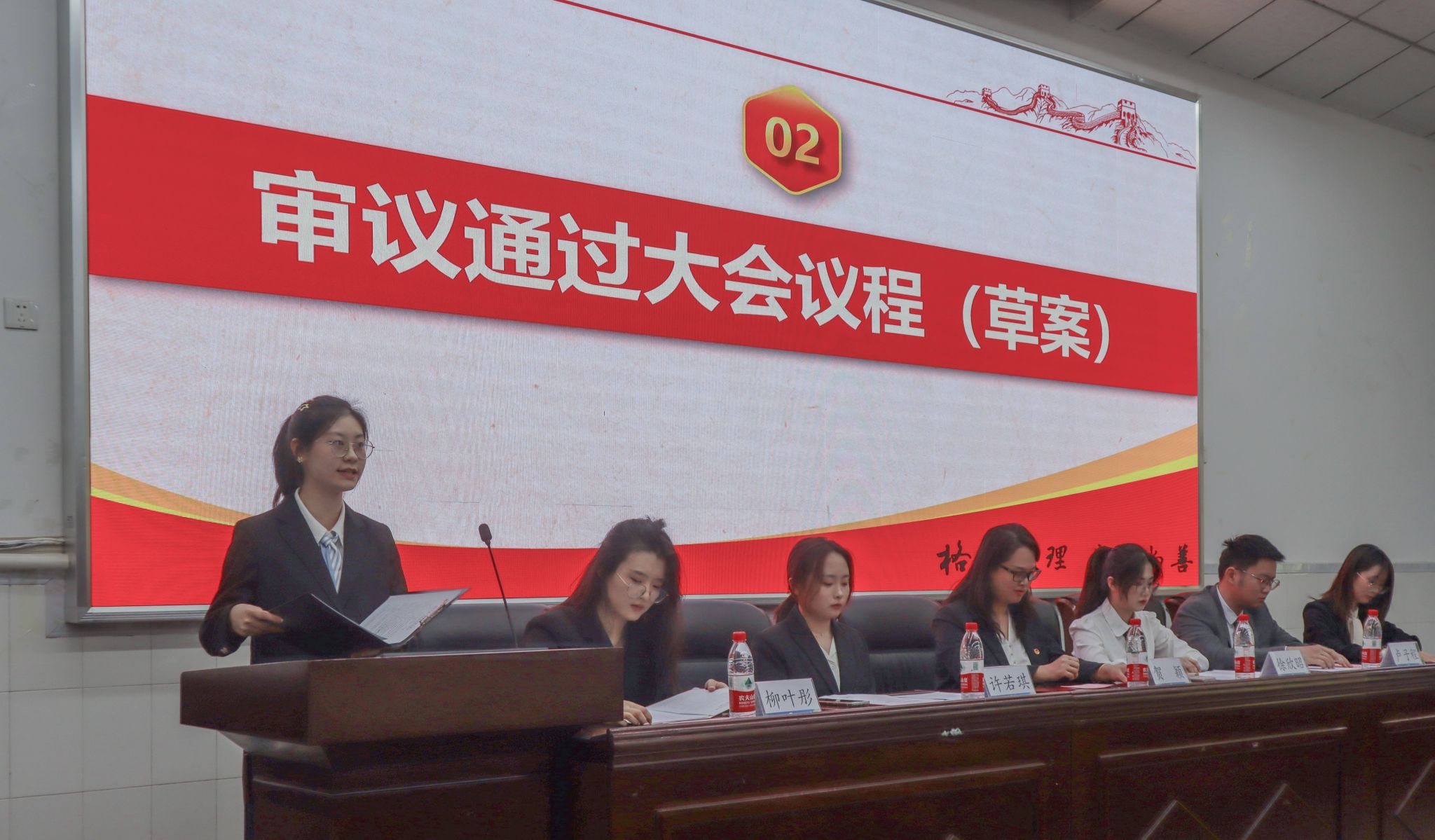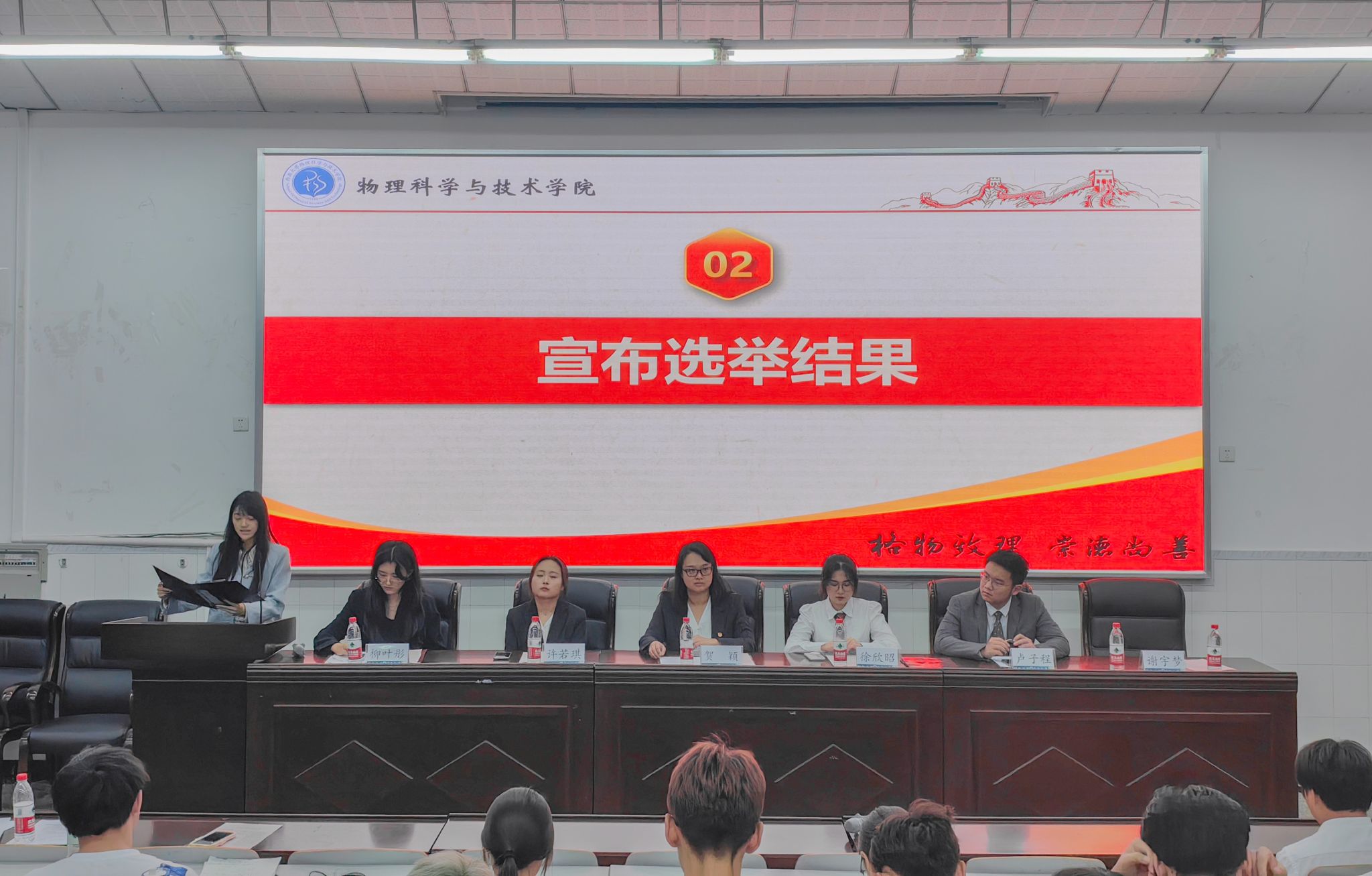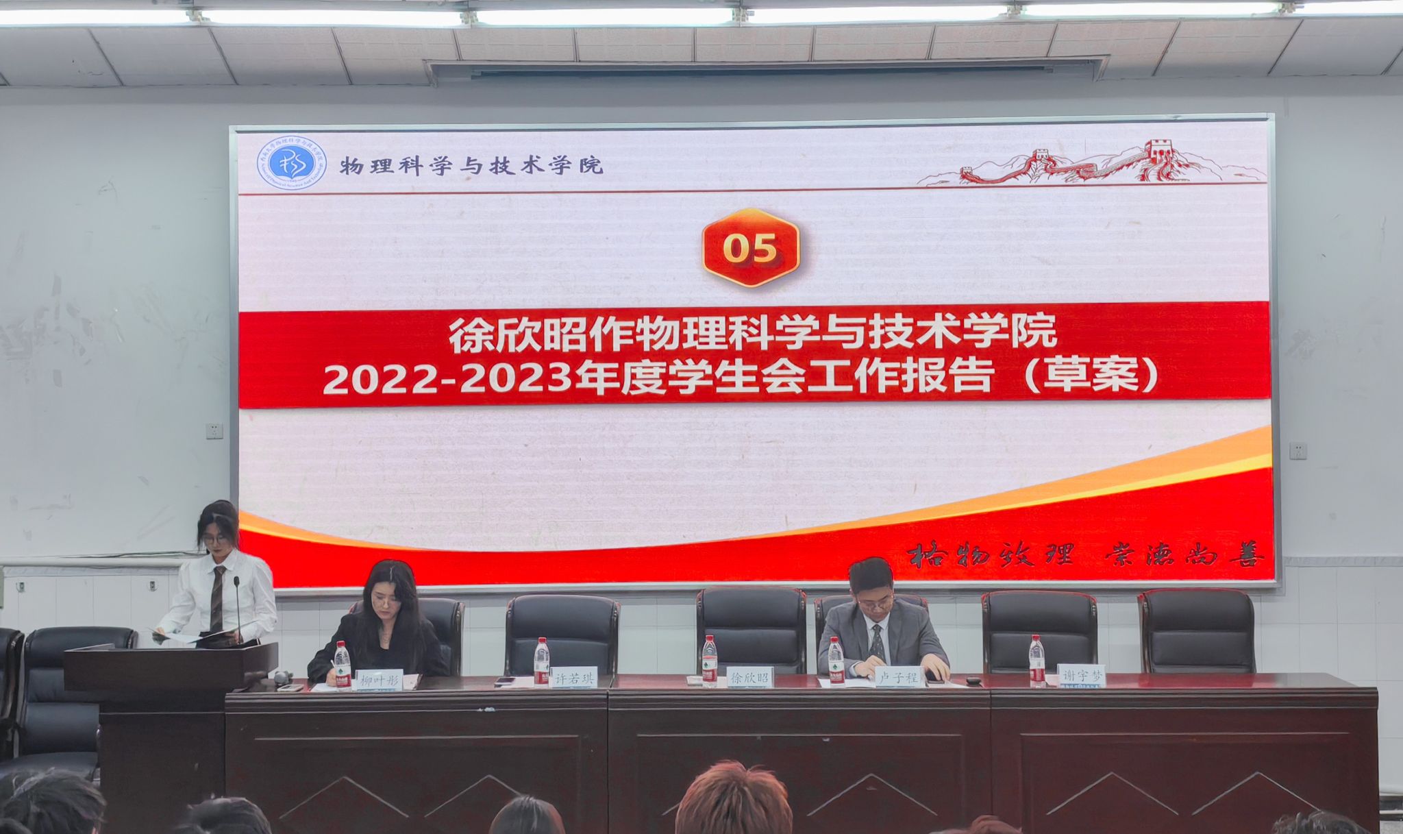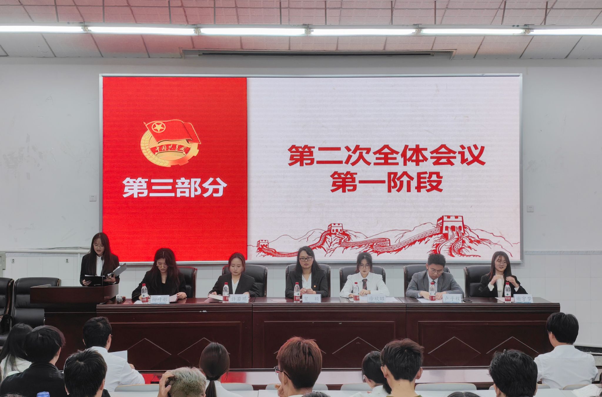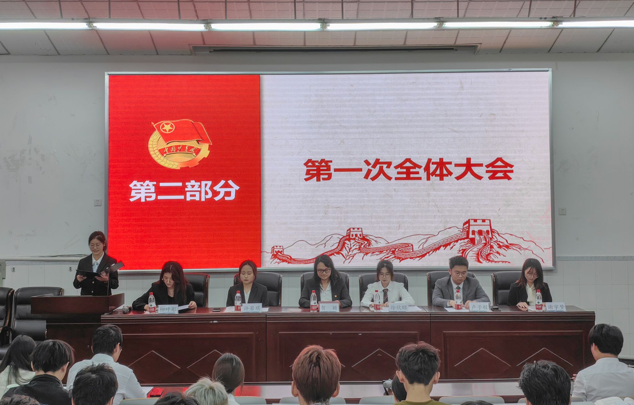 14:40,伴随着慷慨激昂的国歌,第一次全体大会拉开帷幕,会议由学生会构学部田雨竺同学主持。宣传中心主任谢宇梦同学、团委副书记许若琪同学分别宣读了院党委会批复和校学委会批复。