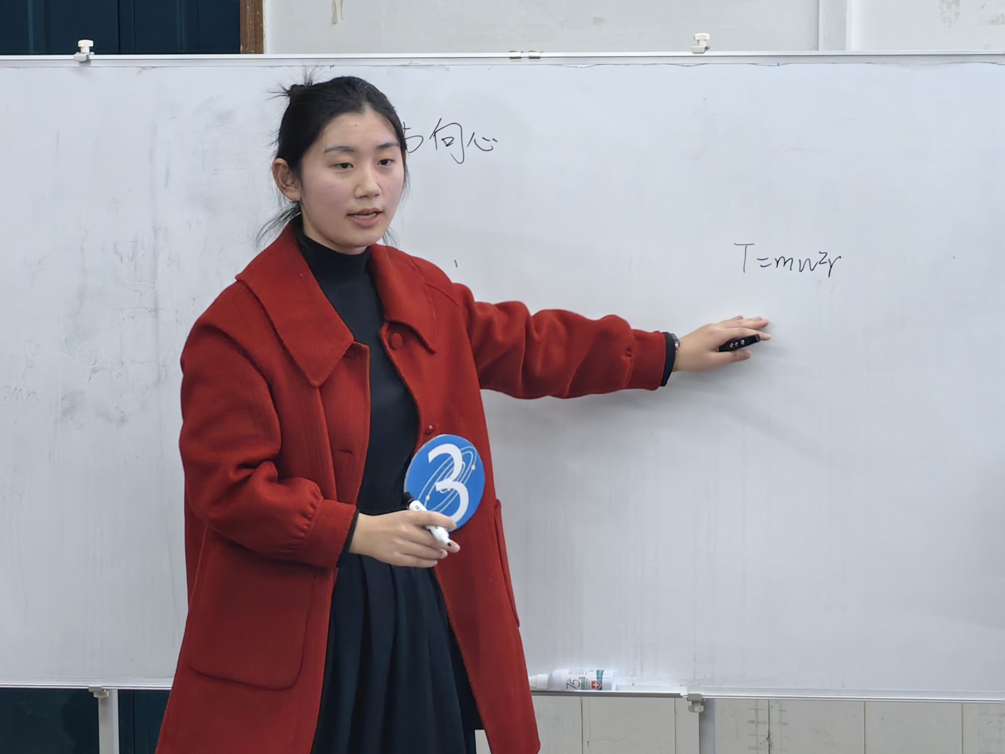 2022级尧嘉煜所讲授的课题是《超重与失重》,她通过挂住钩码的纸带在加速向上时发生断裂的实验,让大家直观感受到超重物体所受合力向上使得加速度向上,失重物体所受合力向下使得加速度向下的原理。讲课过程中,她教态落落大方,颇具亲和力。