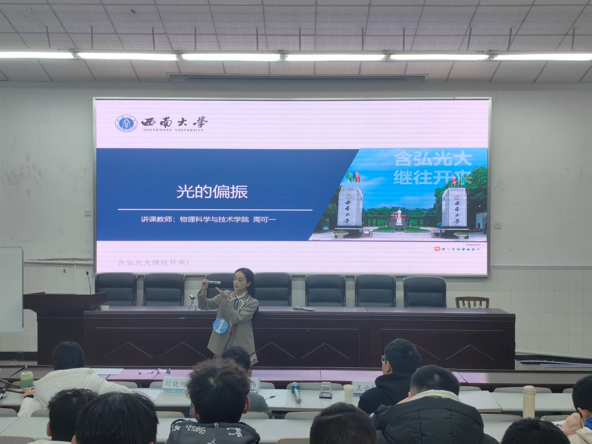 接下来上场的是讲课组。首先由2021级周可一讲授课题《光的偏振》。她以一个穿墙而过的小魔术为开头,引出光的透射强度与偏振现象的关系,整体教学节奏紧凑,语言表达流畅。
