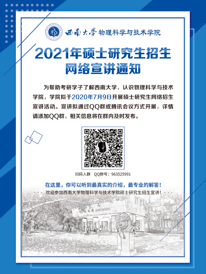 为帮助考研学子了解西南大学,认识h漫 ,h漫 拟于2020年7月9日开展硕士研究生网络招生宣讲活动。宣讲拟通过QQ群或腾讯会议方式开展,详情请添加QQ群,相关信息将在群内及时发布。 QQ群:963525991 在这里,你可以听到最真实的介绍,最专业的解答!