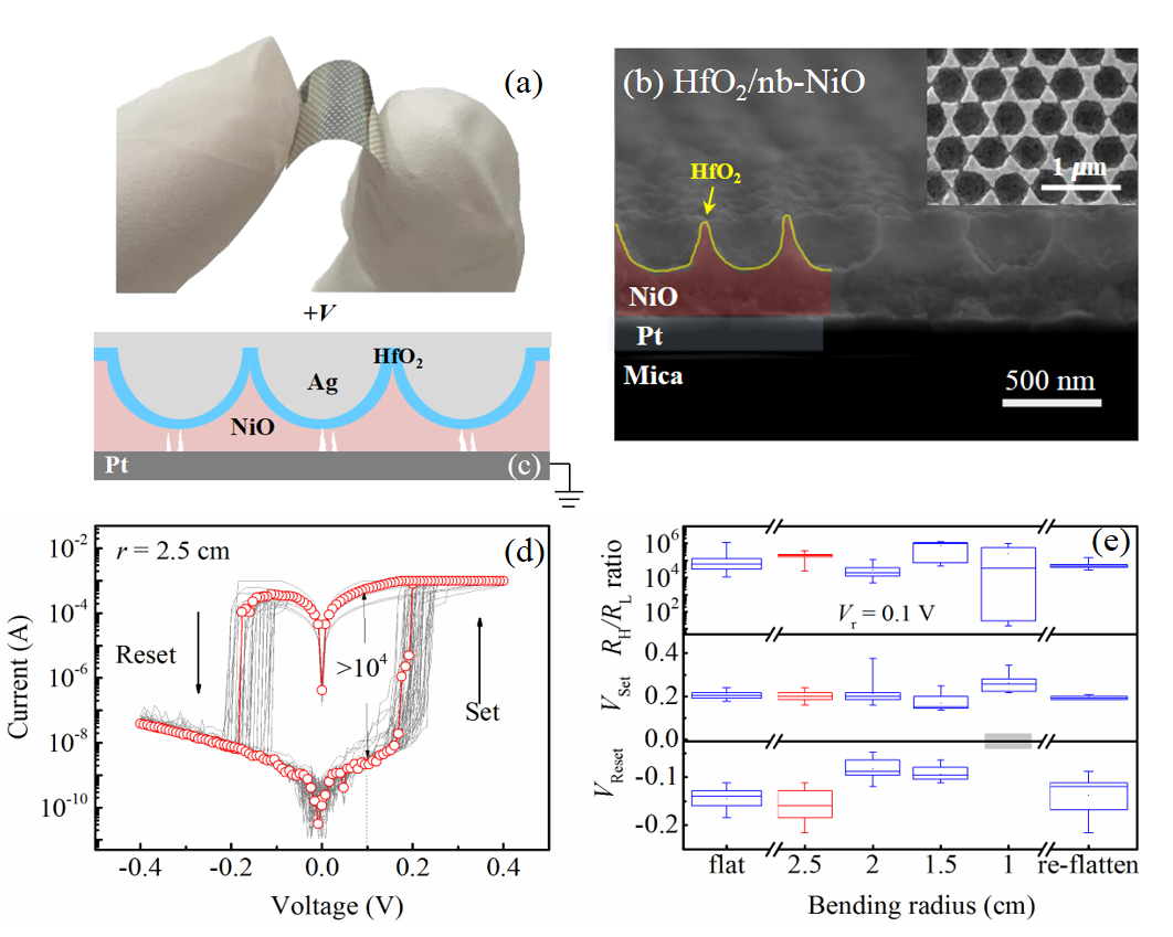 图1 NiO纳米碗状阵列RRAM器件的(a)实物图,(b)横截面和表面SEM照片,(c)导电细丝空间分布示意图,(d)弯曲状态下器件的I-V回线以及(e)耐受性和稳定性表征