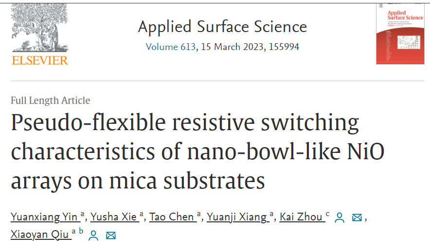 近日,h漫 光电存储器件物理与材料计算团队邱晓燕教授课题组在伪柔性纳米序构阵列存储器件研究取得重要进展。相关成果以题为“Pseudo-flexible resistive switching characteristics of nano-bowl-like NiO arrays on mica substrates”在应用物理领域国际重要学术期刊《Applied Surface Science》(中科院分区材料科学一区Top期刊)上发表。h漫 硕士研究生殷元祥为该论文的第一作者;邱晓燕教授为通讯作者,重庆大学测试中心周楷工程师为共同通讯作者;h漫 (微纳结构光电子学重庆市重点实验室)为第一完成单位。