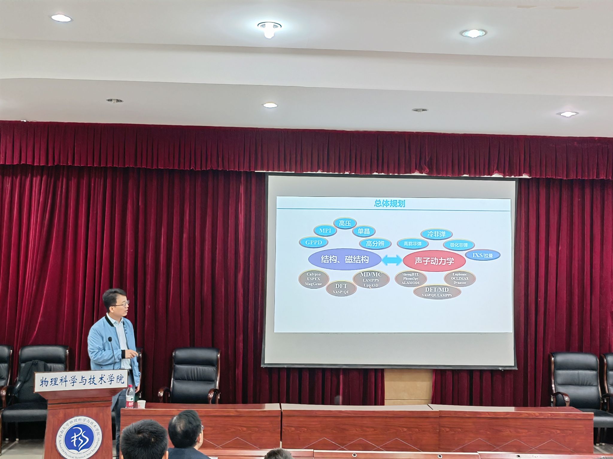 的热情邀请表示感谢,接下来主要分享其团队近年来在单层Sn、Kagome晶格135及166体系的超导电性、CDW和拓扑态等方面的研究,并细致分析了压力及电子温度等对这些物态的调控,引发了同学们的深刻思考。王保田副研究员既有深度又有高度的报告开拓了同学们的眼界,激发了同学们的兴趣,加深了同学们对于结合第一性原理计算和中子散射实验研究材料结构和声子动力学的理解并提供了新的思路。