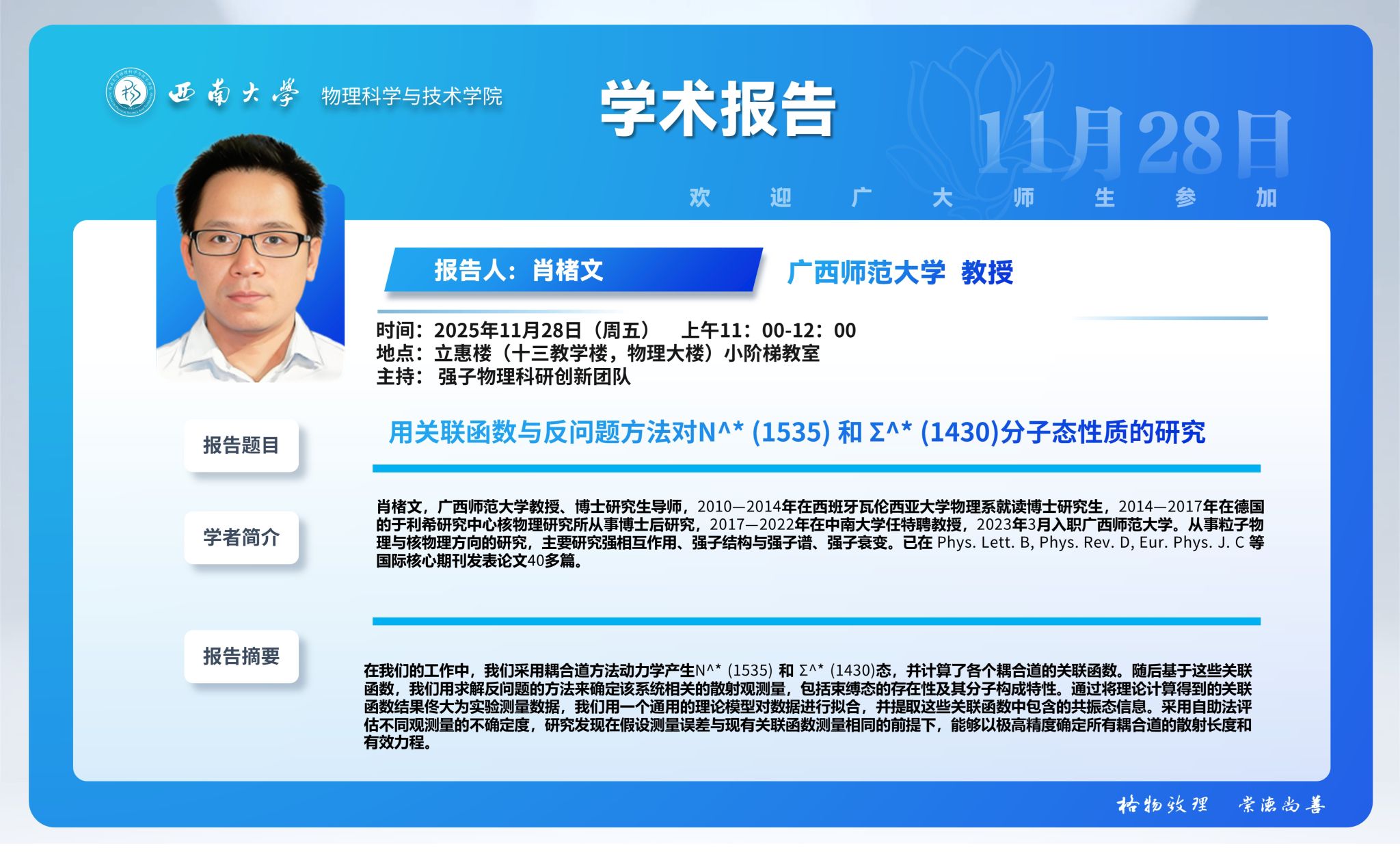 【学术报告】用关联函数与反问题方法对N^*(1535)和^*(1430)分子态性质的研究