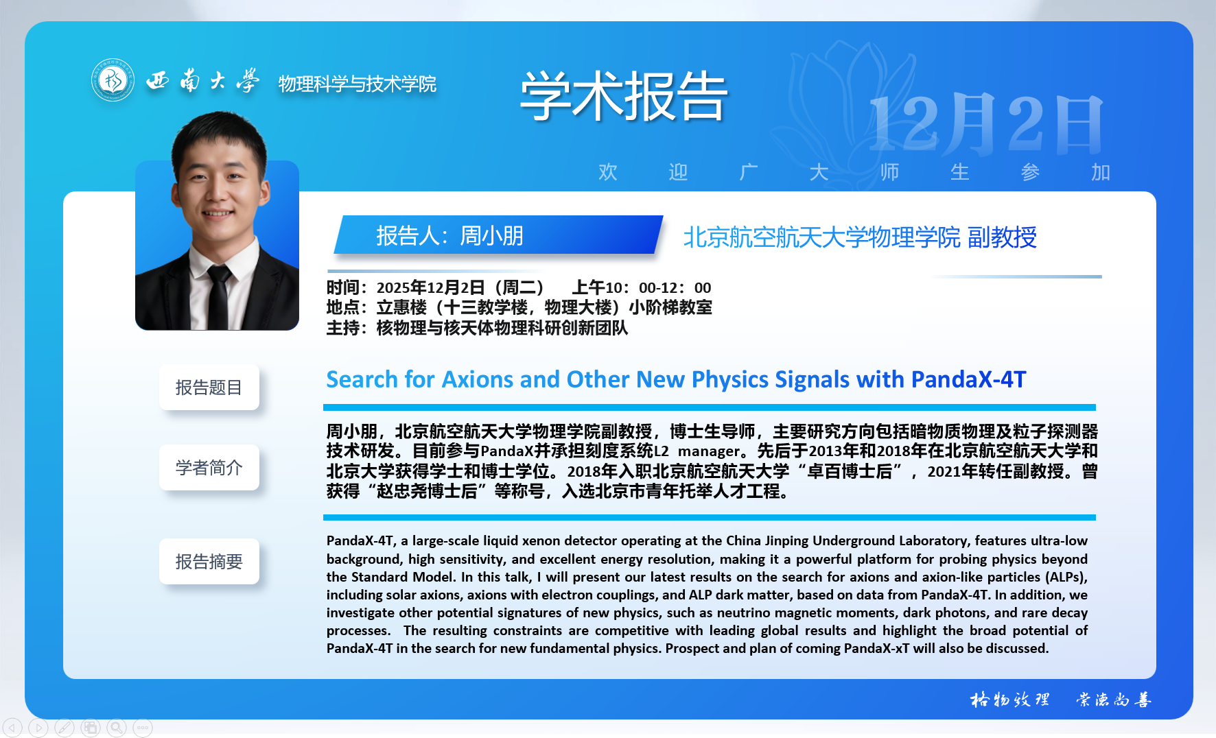 【学术报告】Search for Axions and Other New Physics Signals with PandaX-4T