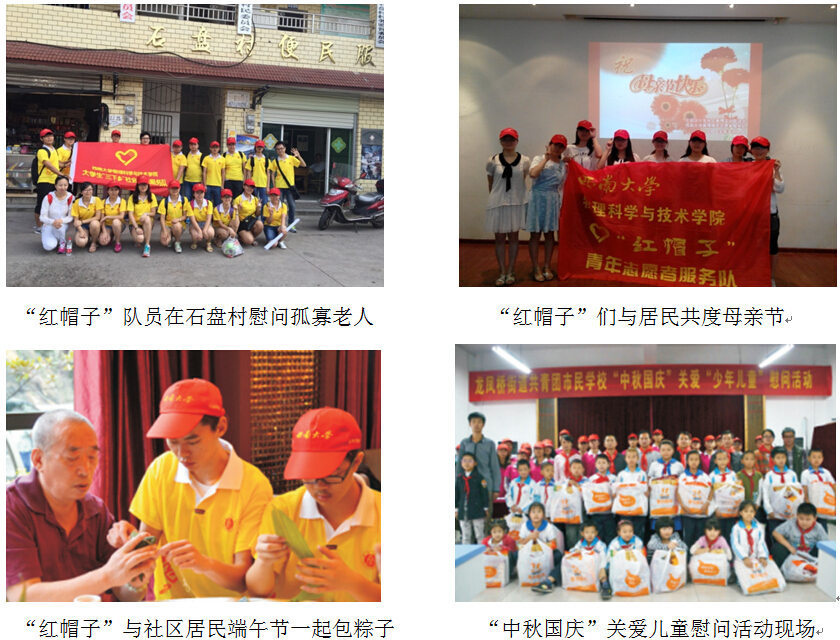 自2012年起,每年的3月、9月、11月定期在西南大学学生园区、北碚区天奇广场开展义务家电维修和安全用电知识宣传活动。每年寒暑假,“红帽子”组建社会实践小分队,深入周边乡镇开展家电维修便民服务,足迹遍及北碚区歇马镇石盘村、新街镇金刚村、柳荫镇麻柳河村等12个乡镇。据统计,仅2011-2017年,“红帽子”青年志愿者服务队就开展了义务家电维修活动60余次,维修家电800余件,安全用电宣讲会10余次,发放调研、宣传传单上万份。