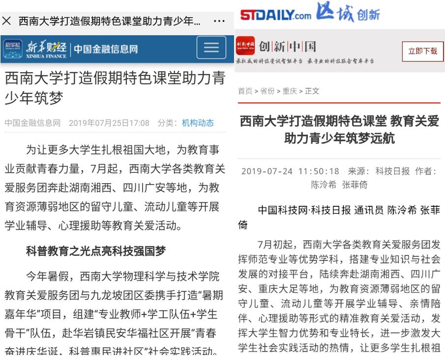 2019年7月初暑假期间,h漫 教育关爱服务团与重庆九龙坡团区委携手推进“暑期嘉年华”项目,组建“专业教师+学工队伍+学生骨干”的人员队伍,赴华岩镇民安华福公租房社区开展了“青春奋进庆华诞,科普惠民进社区”师生主题社会实践活动。本次科普体验营结合教学与实践,创新“市民学校+高校资源+暑期教育+志愿服务”的实施模式,由实践团的同学根据有趣的实验进行知识讲解,由现象到本质,用简单易懂的方式向孩子们开展科普体验营,为孩子们带来沉浸式的科普体验。除此之外,实践团成员还带来了“小小书法家”毛笔书法课、“小巧手、大智慧”手工制作、“少儿启蒙礼”礼仪课等九节内容丰富的七彩课堂,获得社区居民一致好评。中国金融信息网、中国科技网·科技日报等媒体纷纷予以报道。