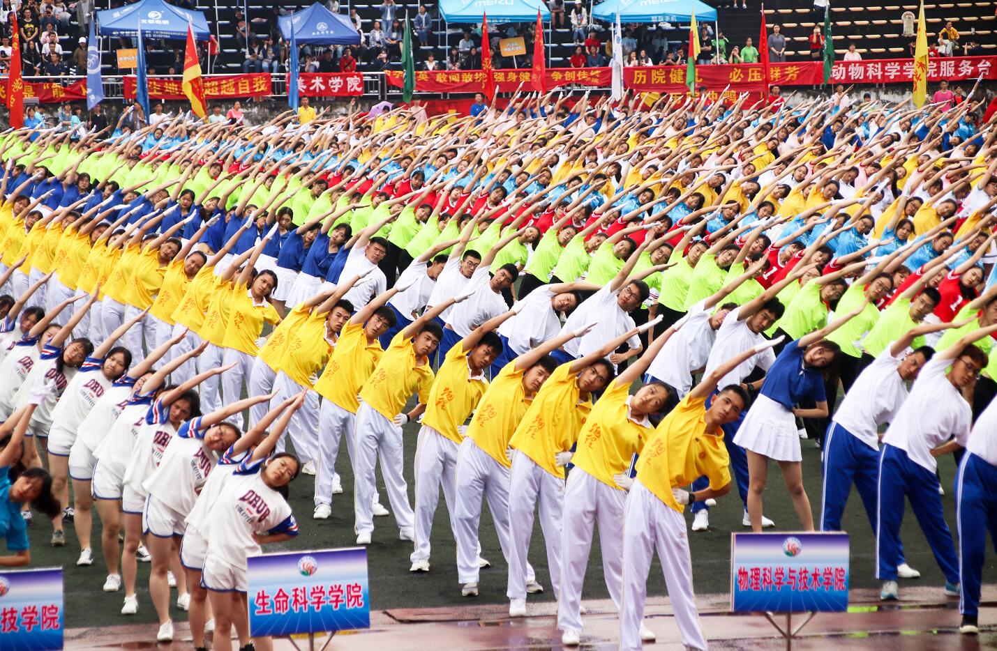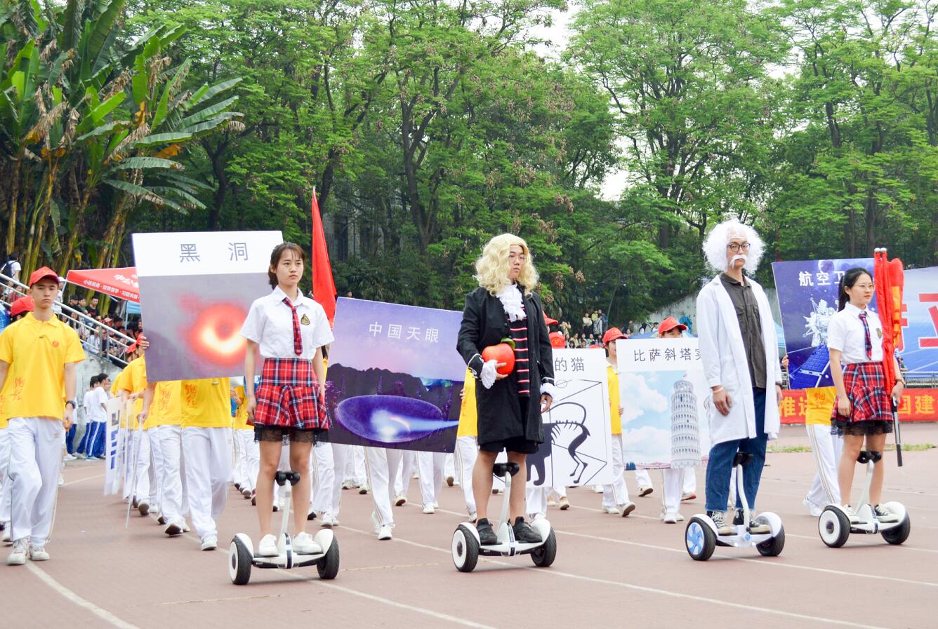 4月18日上午,学校第十四届田径运动会在第二运动场开幕。开幕式上,伴随着激扬的进行曲, 60名学子身着明黄色院服,手持星形气球,迈着铿锵有力的步伐作为第一个h漫 方阵率先入场。方阵前排学生化身为“爱因斯坦”“牛顿”,脚踏平衡车,徐徐走近主席台,紧跟在他们身后的一排印有“中国天眼”“航空卫星”“黑洞” “薛定谔的猫”等物理科学发现发明的图片。走过主席台时,方阵举出“格物致理,崇德尚善”的院训标牌,齐声喊出 “格物致理,自强不息,兴我物院,永争第一”的口号,展示的横幅“奋斗的青春没有黑洞”充分展示了他们的青春态度和顽强拼搏的信念决心。