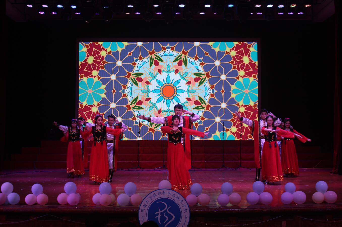晚会分为 “相遇·立惠之约” “成长·物韵韶华” “扬帆·百年新途” 三个篇章。晚上七点,以毕业生青春记忆为主题的开场视频拉开了整场演出的序幕,随后舞蹈《寄明月》闪亮登场,台上的灯光音效与观众热情舞动的荧光棒完美配合,瞬间点燃了全场。第一篇章讲述了相遇的故事,歌曲《男孩》带领大家回到了刚踏入校门的2017年秋天,向阳成长、微笑启航;十名新疆同学带来舞蹈《天池边的姑娘》,舞步婀娜,演绎了花季少男少女的青春活力;歌舞《可可托海的牧羊人》诉说了一段凄美的爱情故事,赢得了观众们的阵阵掌声。