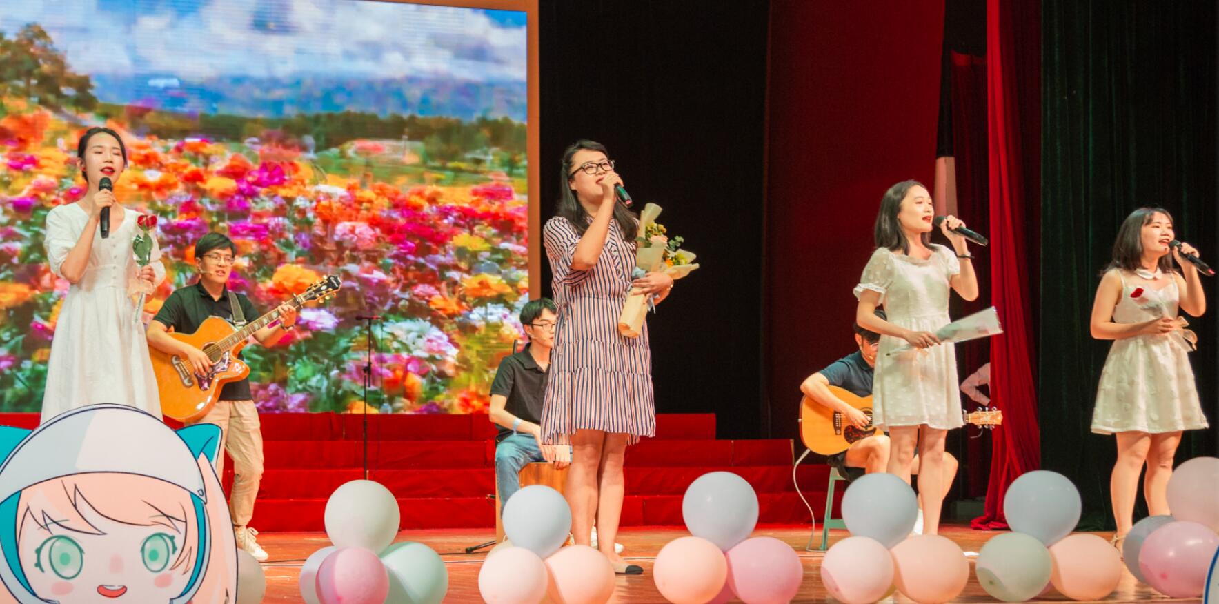 h漫 工会出品的教师合唱视频《天耀中华》拉开了第三篇章的序幕。吉他弹唱《出现又离开》由2017级辅导员贺颖老师和同学们共同参演,表达了毕业生对母校的深情告白,寄托了浓浓的师生情谊;2017级班主任匡泯泉老师与同学们带来了诗歌朗诵《百年礼赞》,讴歌了中国共产党成立100年来神州大地发生的巨大变化,描绘了新时代扬帆再前行的美好愿景。夏光琼、陈晓莉、刘平萍三位女老师组成h漫 “最美天团”一起吟唱《送别》,为2021届全体毕业生送上临别祝福。同学们再度沸腾起来,纷纷向恩师们献花致谢。