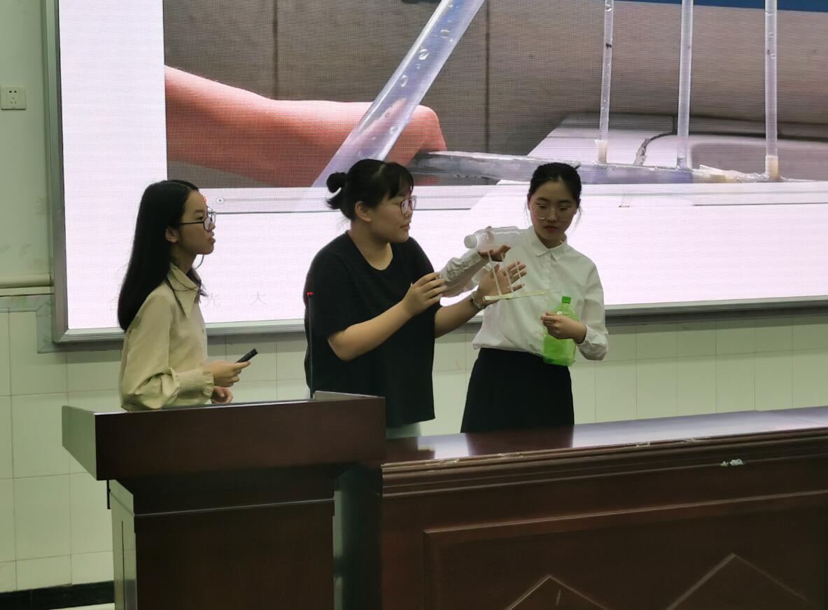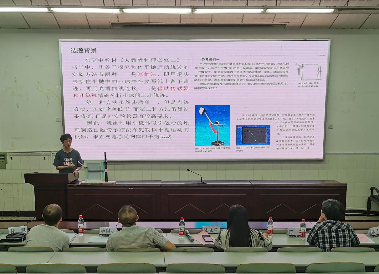 首先上台进行展示的是来自2020级师范一班的陈秋杉、杜润齐,他们的教具“磁粉示踪法研究平抛运动”基于高中物理探究物体平抛运动轨迹的实验中不足,创新性地采用磁粉和磁力小球将运动轨迹显示出来;第二组是来自2020级物理学二班的白倍好、蒋芸西、熊睿琦,他们的教具“平抛运动位置测定仪”关注对平抛运动实验装置的研究,设计出了可以调节轨道宽度和倾斜度的装置;第三组来自2020级物理学一班的方豪,他展示了“电磁炮”的教具设计,其装置的完备性及理论讲解的逻辑性受到了指导老师的一致好评;第四组来自2019级师范二班的田洛忆、杨子娇、石芷瑜,针对流体压强与流速的关系设计了方便学生理解且对气体和液体同样适用的教具——“流体压强与流速关系演示装置”;第五组来自2019级师范一班的张睿珈、孙小玥带来的教具“探究超重失重条件教具模型”,巧妙地采用了转化法,通过薄膜形变量反应物体所受支持力的大小改变,侧面反映了超重、失重时的加速度方向;第六组是由2020级师范一班的嫣然带来的教具——“小孔成像演示仪”,该实验装置含有多种形状以及大小的孔,同时孔的位置可以灵活调节,方便展示不同情况下的小孔成像;第七组来自2020级师范一班的李斗福、赖晓东、陈宇豪同样展示了他们的教具——“小球平抛运动探究装置”,该组同学设计的实验装置既可以探究平抛运动轨迹,又可以验证动量守恒;最后一组来自2019级师范一班的王之时、肖帆的实验装置“看得见的声波”充分发挥创新性,利用视觉暂留、声波等知识在墙面上投映出了正弦波吸引了全场目光。