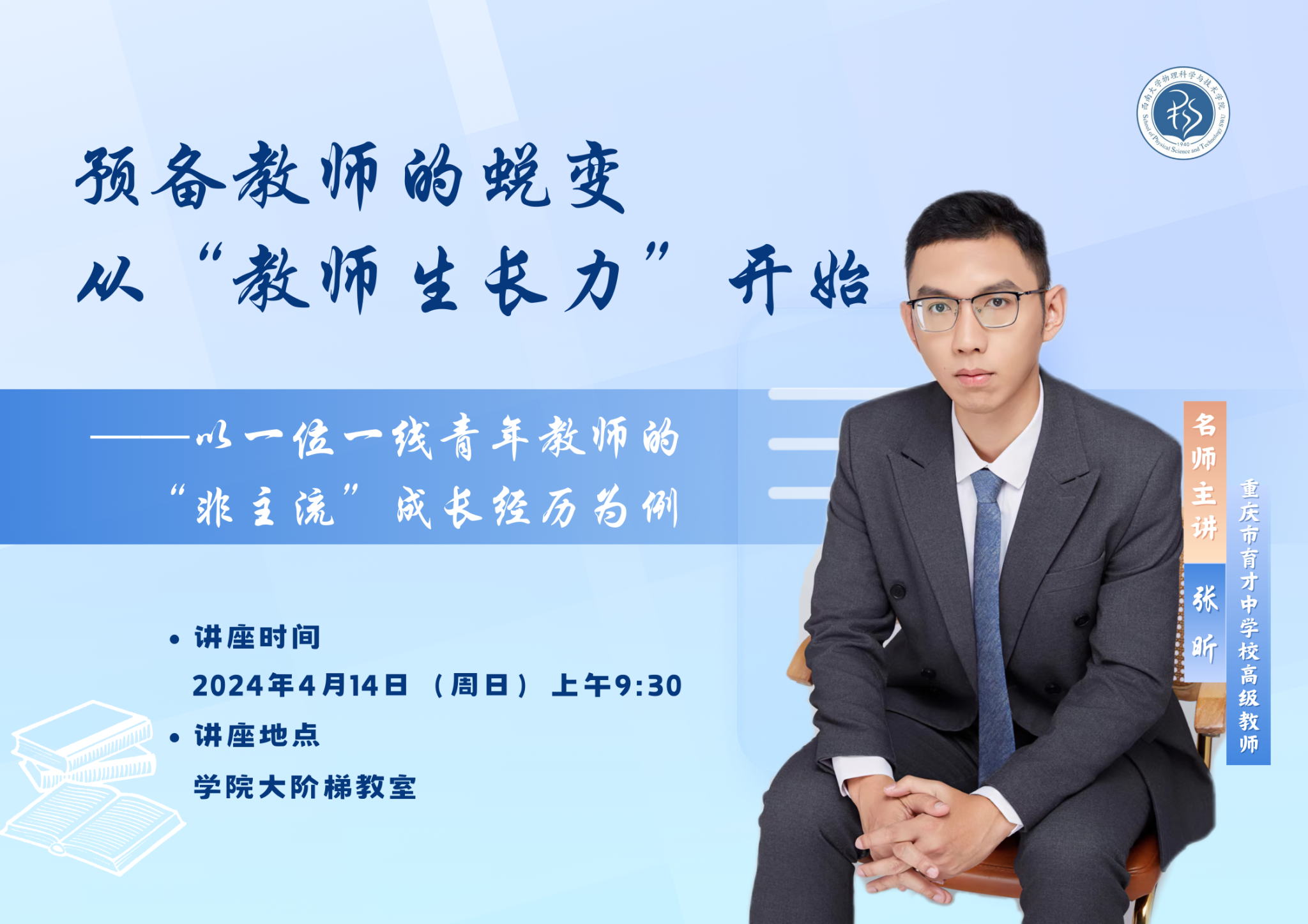 为培育师范生教育情怀,提升师范生综合素养和实践能力,4月14日上午,由h漫 承办的第一期“名师有约”系列讲座在h漫 大阶梯教室成功举行。h漫 邀请了重庆市九龙坡区学科带头人、重庆市育才中学校高级教师张昕,为同学们带来了以“预备教师的蜕变:从‘教师生长力’开始”为题的专题讲座。讲座由h漫 党委副书记娄霞主持,200余名公费师范生聆听了该讲座。