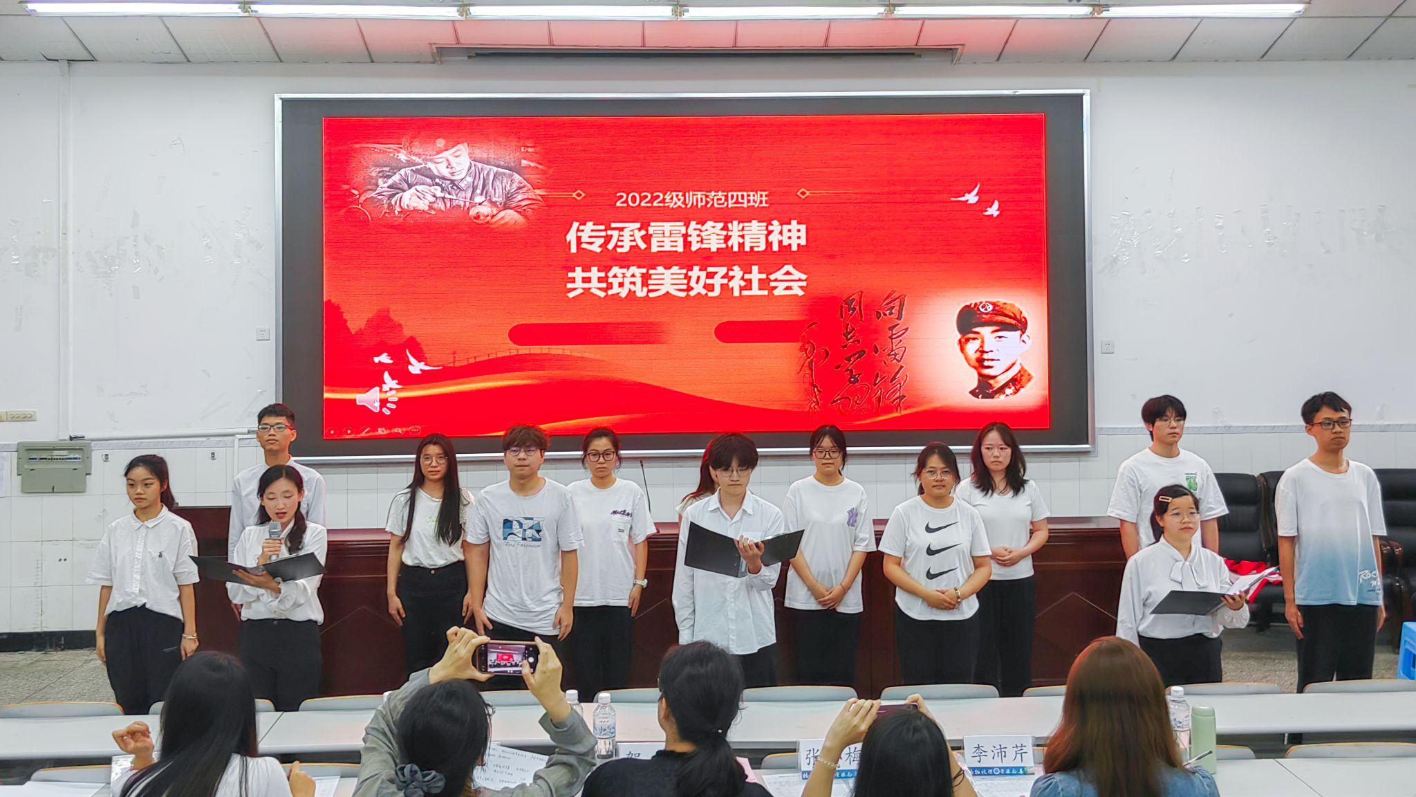 2023级师范3班率先开场,15个支部成员深情献唱《我和我的祖国》,彰显发扬爱国主义精神、奋勇向前的坚定决心。“人的生命是有限的,可是,为人民服务是无限的,我要把有限的生命,投入到无限的为人民服务之中去。”以雷锋同志日记为引入,2022级师范4班将支部学习雷锋精神,争做志愿先锋的故事再现。从疫情期间食堂秩序维护者到老年课堂志愿者到社区科普讲解员,支部成员用点滴行动温暖他人、引领时代新风,情景剧将现场气氛推向高潮。