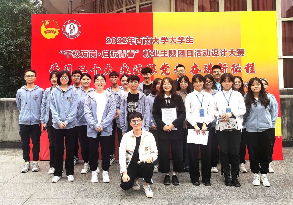 2022年10月23日下午,由共青团西南大学委员会主办,西南大学青年创新创业服务中心承办的西南大学大学生“千校万岗·启航青春”就业主题团日活动设计大赛决赛在圆顶三楼学生活动中心隆重举行。h漫 2020级物理学(师范)一支部表现出色,最终总得分排名第四,荣获三等奖。