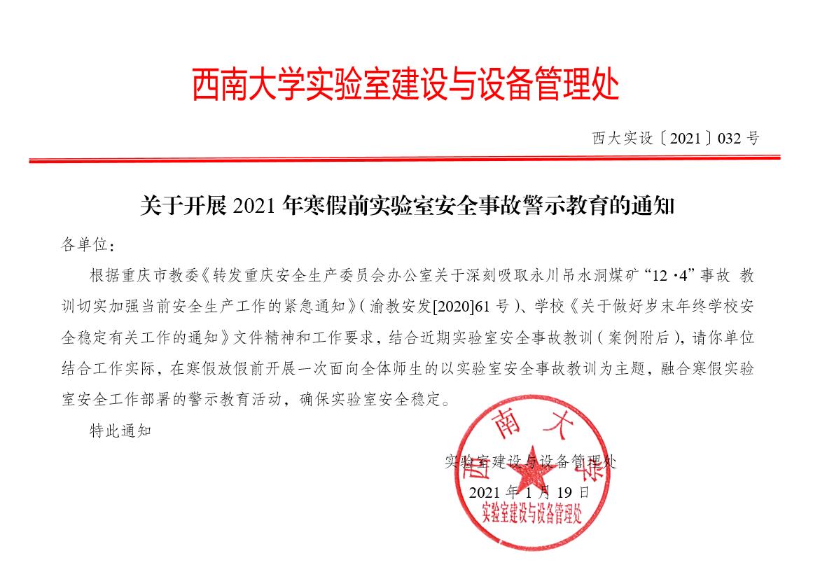 2020年12月8日上午10:20左右,我校1个实验室师生在开展横向科研项目实验时,未将有毒害的显影液和漂洗液规范收集与处置,造成楼宇过道弥漫刺激性气味,威胁人体健康。根据《西南大学实验室废弃物处置管理办法(试行)》(西校[2016]731号)和《西南大学实验室技术安全责任追究办法(试行)》西校[2019]41号),对该实验室进行全校通报,同意涉事单位对相关责任人的处理方案:取消该实验室安全责任人年度评优资格、扣罚年终绩效津贴1000元并院内通报批评,涉事学生书面检讨并取消年度评优评奖资格,涉事单位举一反三全面排查整治。
