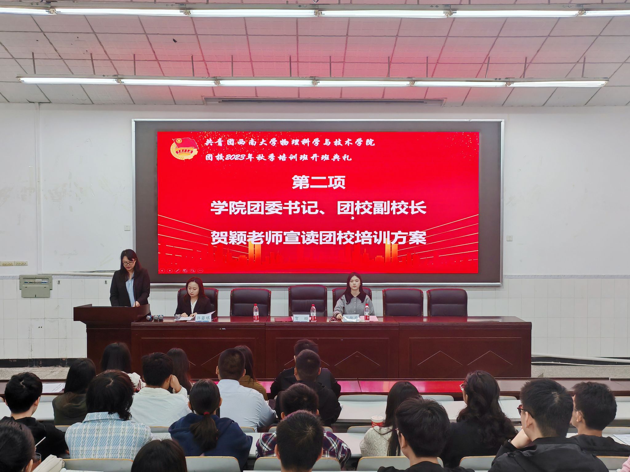 2023年10月22日上午8点30分,团校开班典礼在物理大楼大阶梯教室举行。h漫 团委书记、团校副校长贺颖,2022级辅导员、团校培训班班主任宋佳芮和100名参训学员参会。典礼由h漫 团委副书记、团校培训班班长许若琪主持。