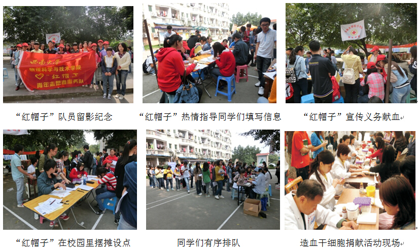 每年10月、11月,“红帽子”青年志愿者服务队都会联合西南大学红十字会分会,举办2-3次献血活动和1-2次造血干细胞采集活动,为缓解血荒、挽救生命出一份力。在志愿者们的带领下,同学们积极参与,单次活动参与人数均不少于600人,血型匹配成功30余人。此外,“红丝带”经常在全校范围内为山区留守儿童、遭遇变故的社会弱势群体组织捐款捐物活动。