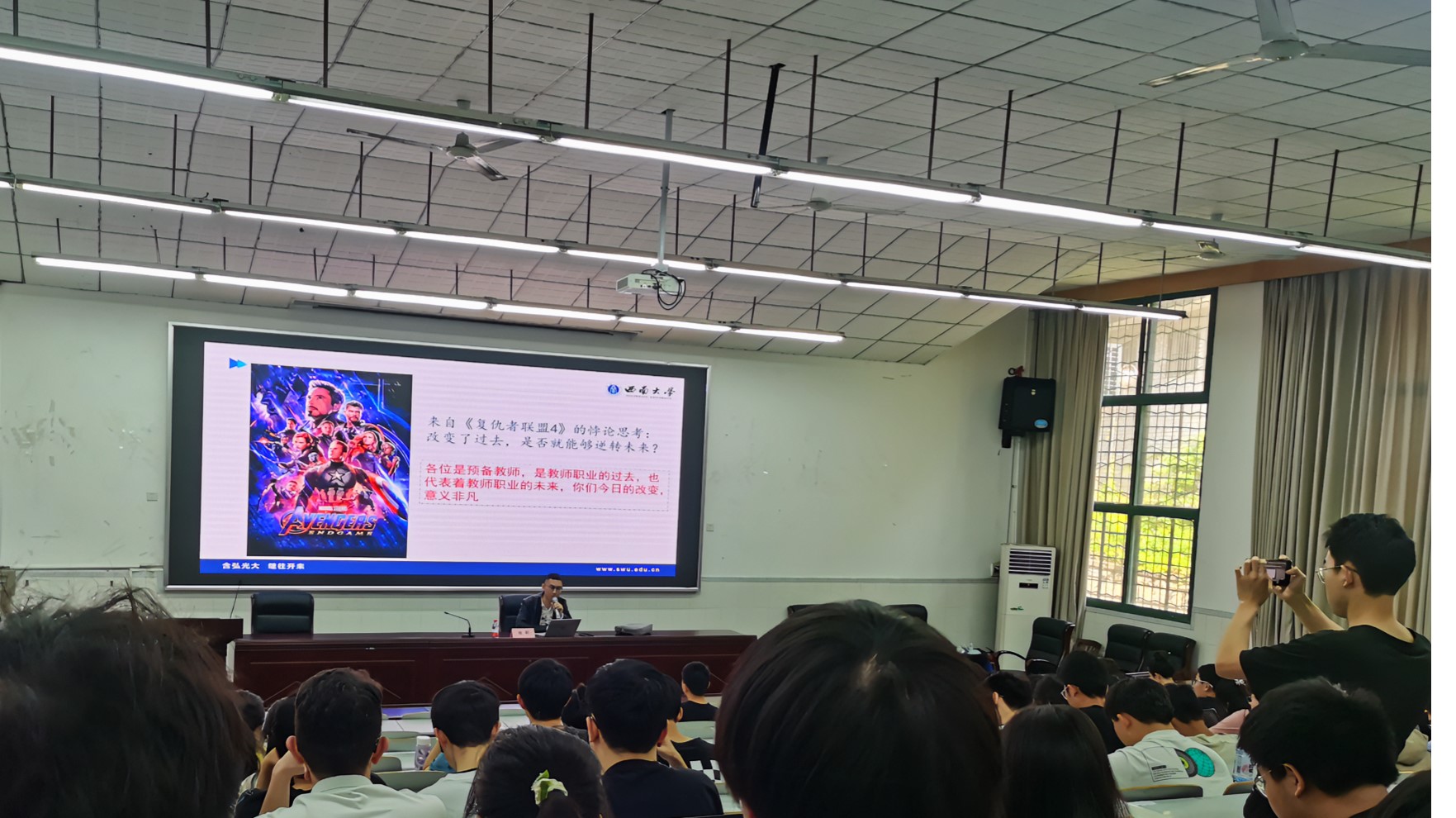张昕老师从电影《复仇者联盟》中的悖论思考引入,深入浅出地阐释了“教师生长力”的丰富内涵和预备教师修炼“教师生长力”的方法和途径。他强调,教师的专业化成长需要链接“洞察力”“储备力”“执行力”“表述力”“意志力”“协作力”“深掘力”“自省力”,我们要让每一股“力”共同推动预备教师驶入成长快车道,让“教师生长力”转化为自己职后发展的核心竞争力。张昕老师思想深邃,语言风趣幽默,现场掌声热烈。